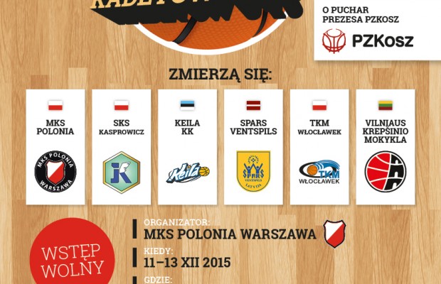 Serdecznie zapraszamy wszystkich kibiców koszykówki na wspaniałe wydarzenie jakim będzie Międzynarodowy Turniej Koszykówki Kadetów U-16 o Puchar Prezesa PZKosz. Turniej odbędzie się w dn. 11-13.12.2015 r. w Warszawie a głównym organizatorem jest klub MKS Polonia Warszawa. Podstawowym celem organizacyjnym było zebranie jak najmocniejszej obsady zespołów z Polski i z zagranicy. Można powiedzieć, że cel został osiągnięty a do stolicy Polski zawitają: TKM Włocławek (mistrz Polski z kategorii U-14), SKS Kasprowicz Inowrocław, Keila KK (Estonia – uczestnik EYBL dywizja 1), Spars Ventspils (Łotwa) oraz Vilnius Basketball School (Dywizja A – Litwa).